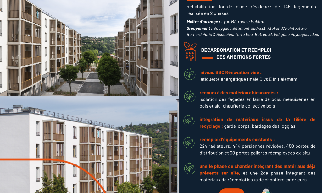 - Un partage d’expérience inspirant sur la réhabilitation de la résidence La Bussière à Oullins menée par Bouygues Bâtiment Sud-Est pour Lyon Métropole Habitat, avec l’accompagnement de Cynéo. Présentation par Karen Loyer et Justine Despatures.